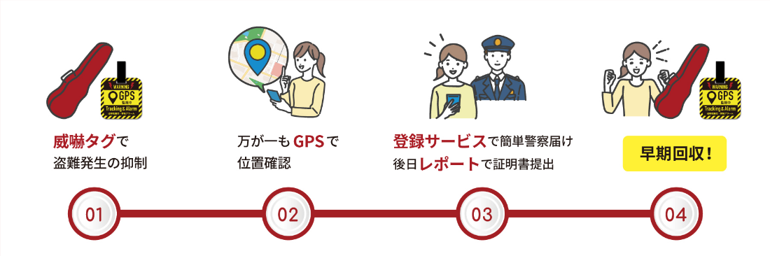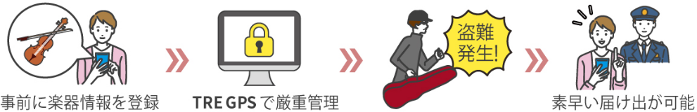 楽器GPSには、大切な楽器をお守りするための便利な機能がたくさんついています。